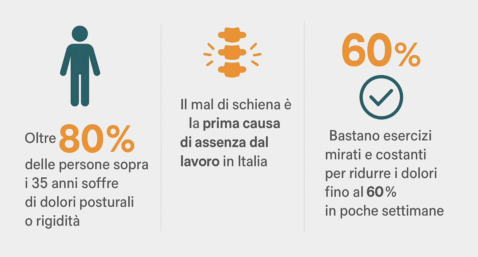 📊 Bastano esercizi mirati e costanti per ridurre i dolori fino al 60% in poche settimane.